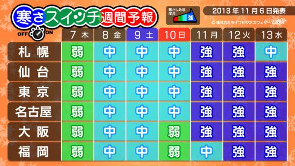 『寒さスイッチ予報』とは・・・この先一週間は寒く感じるのかどうか、一日の気温だけではなく、風や湿度、前日や平年との気温差などを考慮したLBW独自のアルゴリズムをもとに発表している予報