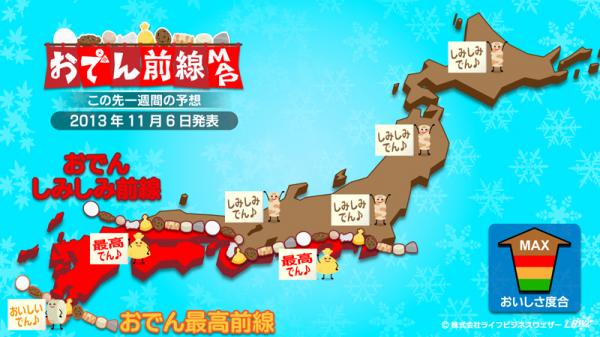 『おでん前線』とは・・・体感気温などの要素からLBW独自のアルゴリズムから導きだした「おでんの食べ頃」を伝える予報。「食べるなら今でしょ!」というタイミングがわかります。
