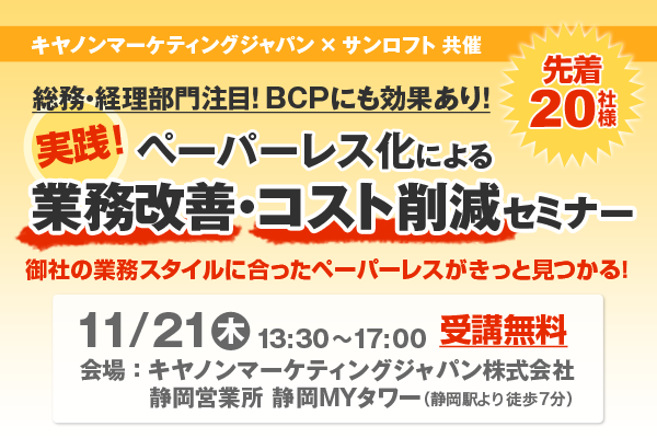 Webサイト制作やシステム開発事業を中心に、中小企業のIT化支援に取り組む株式会社サンロフト(静岡県焼津市、代表取締役社長:松田敏孝)は、2013年11月21日(木)にキヤノンマーケティングジャパン株式会社静岡営業所にて、総務部担当者を対象とした無料セミナーと展示会を開催します。本セミナーは、これまでプリンター活用を通して、お客様目線で社内業務の課題解決に携わってきたキヤノンマーケティングジャパン株式会社と、Google Apps for Businessなどのクラウドサービス導入によるペーパーレス化の実践や支援を行っている株式会社サンロフトとの共催です。ペーパーレス化によるオフィス業務の改善法やコスト削減法を学べる内容です。