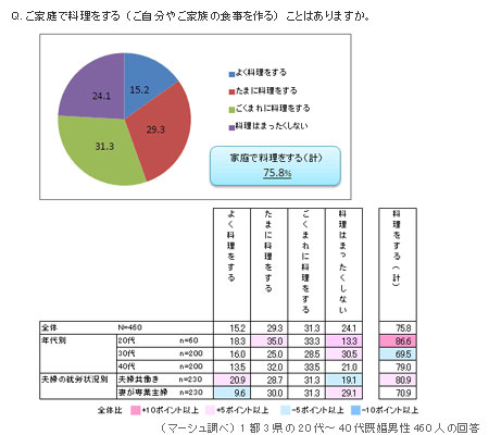 まず、自分が家庭で料理をすることが「ある」と答えた男性は、「ごくまれに料理をする」も含めると、75.8%に上りました。