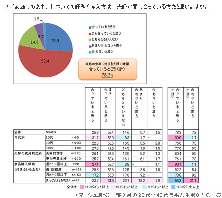 続いて、“家庭の食事”についての好みや考え方が、夫婦の間で合っていると思うかどうかを尋ねたところ、8割近い78.3%の男性が「合っていると思う」と回答しました。(「合っていると思う」(25.9%)、「まぁ合っていると思う」(52.4%)の合計)
