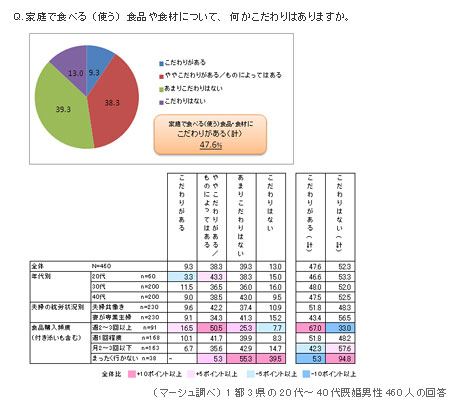 最後に、家庭で使う食品や食材に関するこだわりの有無とその内容を尋ねたところ、「こだわりがある」と答えた男性は47.6%でした。(「ある」(9.3%)、「ややある/ものによってはある」(38.3%)の合計)