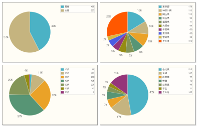 年代比:20代 12%(130名) 30代 26%(289名) 40代 37%(410名)50代 20%(225名)その他(65名)