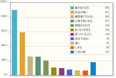 歯が白くなる(920名) 料金が高い(604名)口臭予防にもなる(267名)歯医者に行かないとできない(263名) 時間がかかる(207名)白くなりすぎる(109名) 思っているよりも白くならない(101名)身近ではない(80名)痛い(70名)しみる(67名)11位以降(184名)