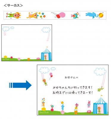 ボールやトランポリン、空中ブランコなどのイラストが描かれたメモ帳に、ピエロ、象など可愛いキャラクターを重ねれば、楽しく演技する可愛いサーカス団に!見ているだけで楽しくなる動きのあるメモが完成。小中学生にお奨めです。