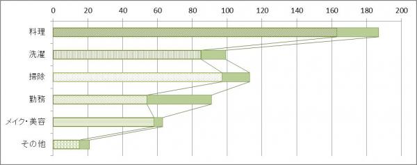 ⇒時短を思い浮かべる場面には、女性の多くが、料理をはじめ、掃除などの家事労働やメイクなどの美容をあげていたのに対し、