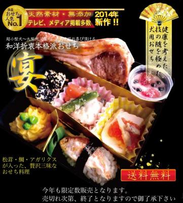商品内容:骨付きラム肉、鯛の祝い寿司、カジキマグロの松茸和え、鶏肉の煮物、鶏松風、金団きんとん、ささみヨーグルト(以上7点入)
