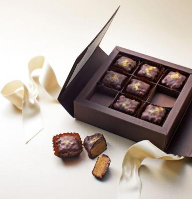 『ゴー・ミヨ』でベルギーのナンバーワンショコラティエに選ばれたショコラティエM。日本産の醤油とチョコレートのコラボレーションから生まれた日の丸デザインの新感覚チョコ。/1箱 2,800円(5%税込み)