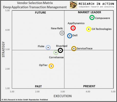 ベンダー10社の戦略と実行能力を評価したResearch in Action社の市場分析レポート「The Need for Speed: Research In Action Vendor Selection Matrix - Deep Application Transaction Management」において、コンピュウェアは、戦略と実行能力の双方において、すべての競合会社よりも上位に位置づけられました。またコンピュウェアは、市場で全体的に最もバランスのとれたソリューションを提供しており、ベンダー10社の中で最高の顧客満足度とマインドシェアを得ていることが判明しました。