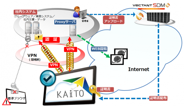 また、Proxyサーバ情報を「VECTANT SDM 管理コンソール」で「KAITO for SDM」に一括設定することも可能です。社内ネットワーク内にProxyサーバを設置している場合、スマートデバイスからのWEB閲覧をProxyサーバ経由で行うよう制御することができます。社内システムはVPNネットワーク上でのアクセス、そしてインターネット上のWEB閲覧は、Proxyサーバを経由するといった運用を、スマートデバイス端末を対象としても行うことで、管理者の意図しない外部サイトの閲覧防止に有効です。