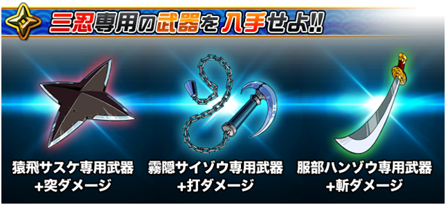 さらに今回は、ボスを倒したあとに入手できる宝箱やイベントガチャで、三忍専用の武器「甲賀手裏剣(猿飛サスケ専用)」「忠心の鎖鎌(霧隠サイゾウ専用)」「龍霧丸(服部ハンゾウ専用)」を入手できます!これらの武器は、三忍のスキルに追加ダメージを付与することができます。