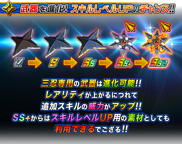 三忍専用の武器はそれぞれ「R」「S」「SS」「SS+」「SSS」のレアリティがあり、三忍に追加スキルをつけるだけでなく、三忍の強化素材(効果2倍)としても利用可能です。よりレアリティ―が高い素材ほど、素材にした時の強化値が高くなります!