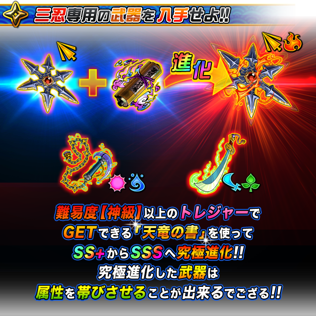難易度【神級】以上のトレジャーで入手できる『天竜の書』を使って、三忍専用の武器を「SS+」から「SSS」へ究極進化させることができます。究極進化すると、突の武器に「炎+突」のように、属性を帯びさせることが可能になります。
