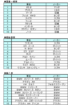国産一般車部門では6車種が入れ替わり、ランキングが大きく変動しました。