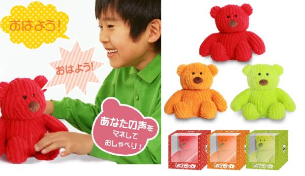 話しかけると上下に動きながらマネして話す おしゃべりモノマネぬいぐるみ 待望の第二弾は、愛され度ナンバー1のクマが登場。スイッチで高い声と低い声の切り替えが可能です。2パターンの声で楽しさも2倍にバージョンアップしました。
