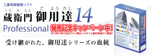 株式会社サンロフト(静岡県焼津市、代表取締役社長:松田敏孝)は、工事写真管理の定番ソフト「蔵衛門御用達 14 Professional」を、2013年11月22日から2013年12月23日まで「発売記念キャンペーン」期間とし、以下のとおり最大40%OFFの特別割引価格にて販売を開始しました。