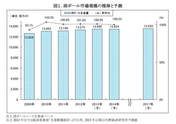 ◆ 2012年の段ボール市場規模は132.8億m2、2013年は前年比0.9%増を予測