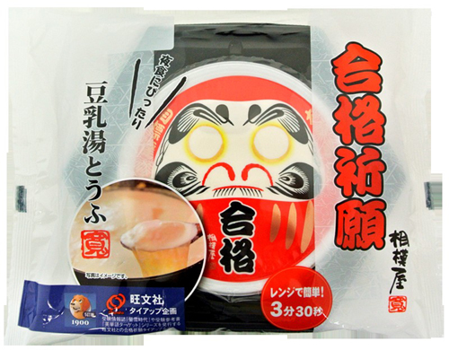 クリーミィな食感と濃厚な味わいがご好評をいただいております『とろり湯葉のつくれる豆乳湯とうふ』のパッケージを一新。だるまのイラストと『英単語ターゲット1900』のロゴをあしらい、『合格だるま豆乳湯とうふ』として期間限定販売いたします。『合格だるま豆乳湯とうふ』は、1人でも食べきることができるサイズです。調理器具や食器不要で電子レンジで3分30秒温めるだけで美味しく食べていただけるので、受験生の夜食としてもぴったりです。