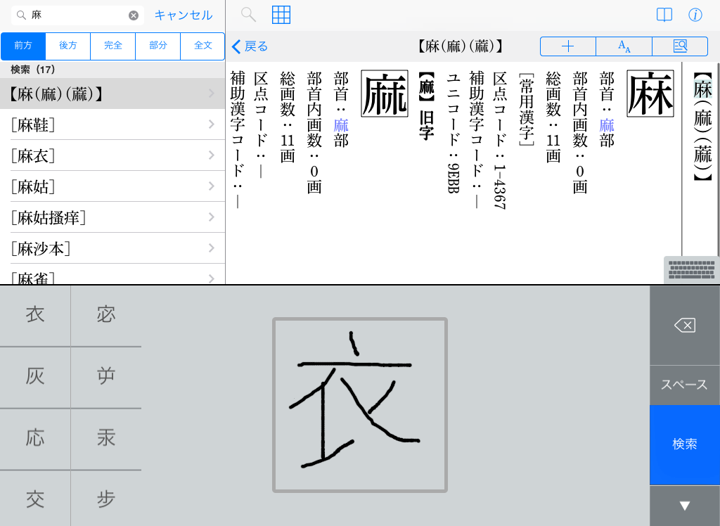 ●豊富な検索オプションを用意(前方一致 / 後方一致 / 完全一致 / 部分一致 / 全文検索)。それぞれの検索方法で、文字を入力すると候補見出し語が表示されるインクリメンタルサーチに対応。(部分一致、全文検索を除く)用語をうろ覚えでも検索が容易です。さらに区点コード、補助漢字コード、ユニコードでも検索ができます。