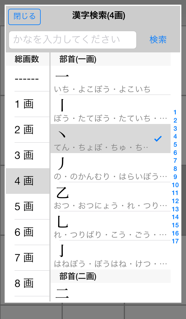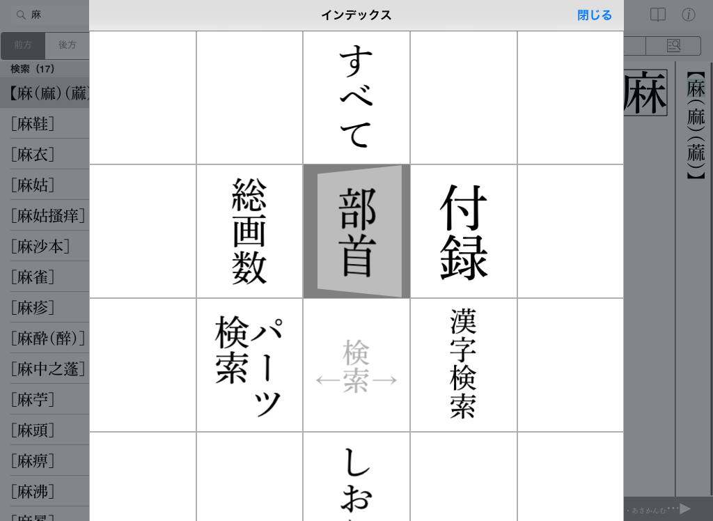 ●漢字源ならではの漢字検索方法として、パーツ検索、部首検索、画数検索、読み検索を利用できます。