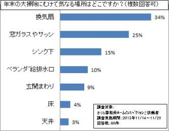 業界初の個人向け不動産コンサルティング・ホームインスペクション (住宅診断)を提供している “不動産の達人 株式会社さくら事務所” (東京都渋谷区/代表:大西倫加)では この度、同社ホームインスペクション依頼者の皆さまに、 年末の大掃除はどこが気になっているかのお悩みアンケート調査を実施。 集計結果をお知らせいたします。