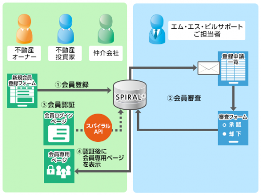 また、スパイラル(R)APIを用いて物件管理ASPと「スパイラル(R)」を連携することによりログイン認証し、アクセスした会員のログイン状況ごとに閲覧ページを切り替えて制御しています。