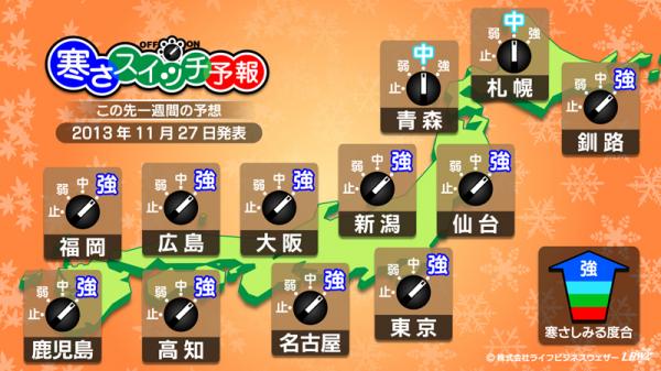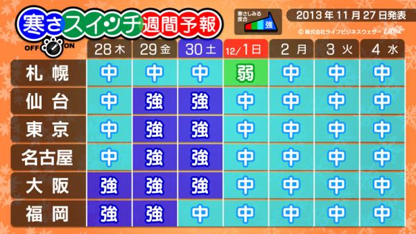 『寒さスイッチ予報』とは・・・この先一週間は寒く感じるのかどうか、一日の気温だけではなく、風や湿度、前日や平年との気温差などを考慮したLBW独自のアルゴリズムをもとに発表している予報です。
