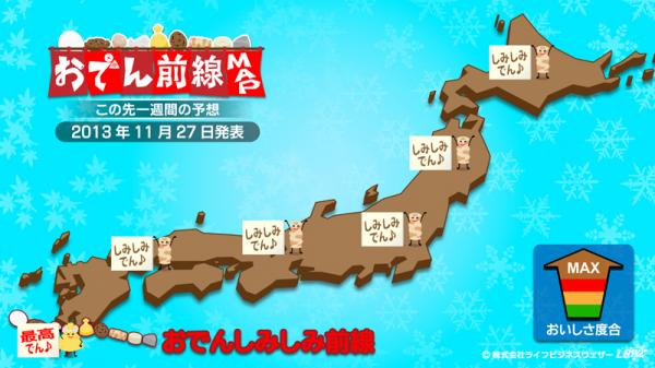 『おでん前線』とは・・・体感気温などの要素からLBW独自のアルゴリズムから導きだした「おでんの食べ頃」を伝える予報。「食べるなら今でしょ!」というタイミングがわかります。