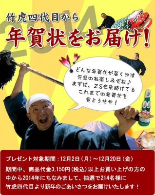 2013年12月2日(月)~12月20日(金)の間に、虎斑竹専門店 竹虎で3,150円(税込)以上お買い上げして頂いたお客様を対象に、抽選で214名様の方へ竹虎年賀状をお送りします。