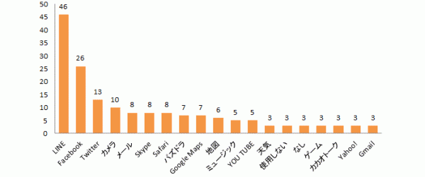 次いで「カメラ」が10件、「skype」「safari」「メール」がそれぞれ8件、その他にも「パズドラ」「グーグルマップ」が7件、「ミュージック」「YouTube」が5件という結果となりました。