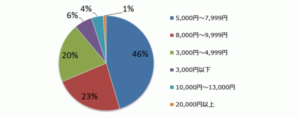 「Q. iPhone使用による月々の支払額(通話料・通信料)は平均していくらぐらいですか?」という設問では、「3000円以下」が6%、「3,000円~4,999円」が20%、「5,000円~7,999円」が46%、「8,000円~9,999円」が23%、「10,000円~13,000円」が4%、「20,000円以上」が1%という結果でした。このことから、全体の95%の人が、月額使用料を10000円以内に抑えていることがわかりました。