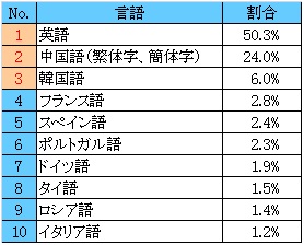 表2)【アウンの翻訳】対応言語ランキングTOP10
