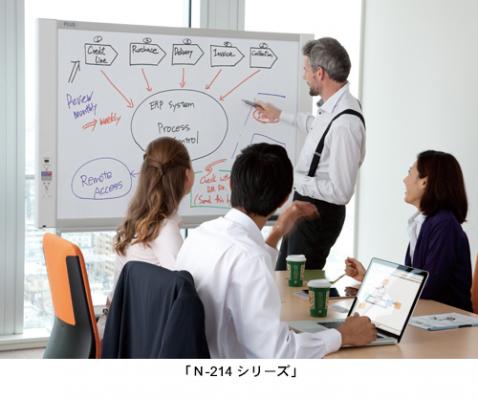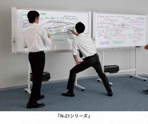 ボードマーカーで書き込んだ内容をシートをスクロールさせながら光学システムで読み取り、印刷やデータ保存ができる会議ツールとして広く活用されるコピーボード。今回発売する新シリーズは、ネットワーク機能を標準搭載した「N-214」、「N-21」シリーズと、手書きと投影画面を合成できるキャプチャーボードの「C-21シリーズ」です。