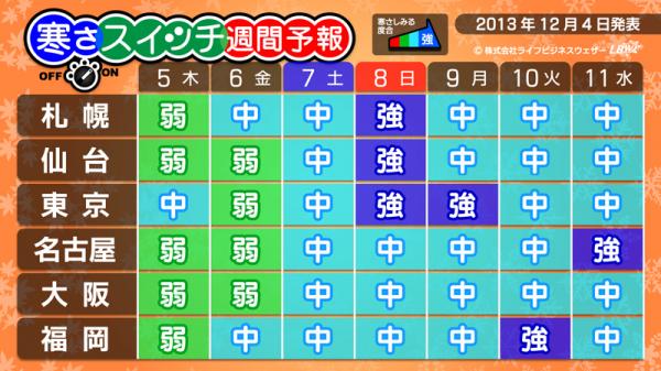 『寒さスイッチ予報』とは・・・この先一週間は寒く感じるのかどうか、一日の気温だけではなく、風や湿度、前日や平年との気温差などを考慮したLBW独自のアルゴリズムをもとに発表している予報です。