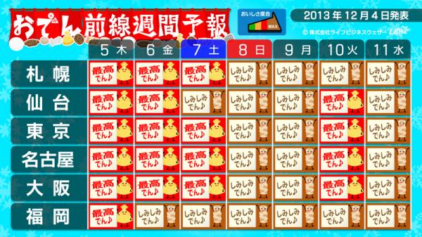 『おでん前線』とは・・・体感気温などの要素からLBW独自のアルゴリズムから導きだした「おでんの食べ頃」を伝える予報。「食べるなら今でしょ!」というタイミングがわかります。