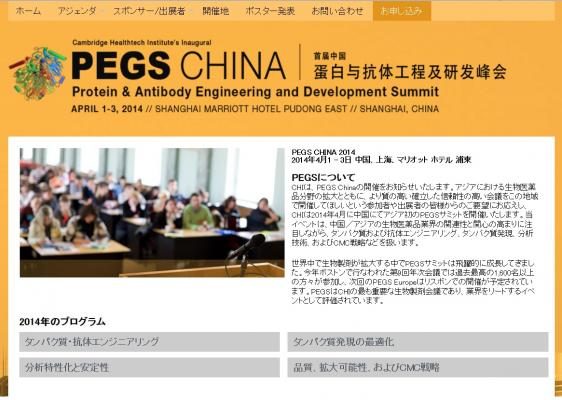 CHIは、PEGS Chinaの開催をお知らせいたします。アジアにおける生物医薬品分野の拡大とともに、より質の高い確立した信頼性の高い会議をこの地域で開催してほしいという参加者や出展者の皆様からのご要望にお応えし、CHIは2014年4月に中国にてアジア初のPEGSサミットを開催いたします。当イベントは、中国/アジアの生物医薬品業界の関連性と関心の高まりに注目しながら、タンパク質および抗体エンジニアリング、タンパク質発現、分析技術、およびCMC戦略などを扱います。