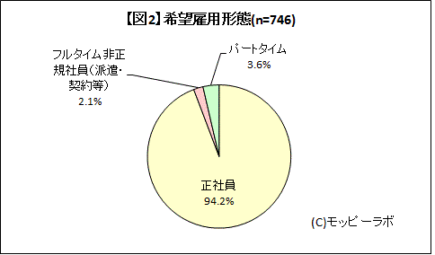 全国の女子学生(短大1-2年生、大学1-4年生)に「女子学生のキャリア意識調査」についてスマートフォンリサーチを実施した。「学校卒業後に就職したいですか」という質問をしたところ、「就職したい」と答えたのは全体の91.7%であった(図1)。専業主婦に憧れる若い女性が近年増えているという話題を耳にするが、当調査では就職に対して積極的な女子学生がほとんどであった。「希望する雇用形態は何ですか」という質問に対して、全体で94.2%の人が「正社員」を選択した(図2)。
