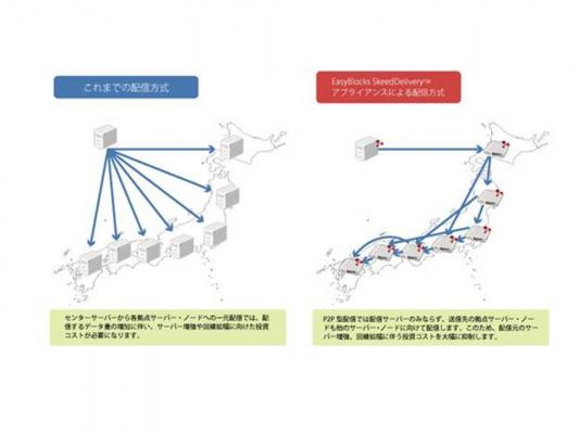 多拠点配信ソリューション「SkeedDelivery」は、多段転送・マルチパスのP2Pアーキテクチャにより、配信先である拠点・店舗側のサーバを他の拠点・店舗への配信にも利用することで、回線やサーバの増強コストを抑制しながら、大量なデータ・コンテンツを極めて高速に配信するソフトウェア製品です。昨年11月に発売開始以来、大手家電量販店のデジタルサイネージコンテンツ配信システムなどで採用され高い評価を得てまいりました。