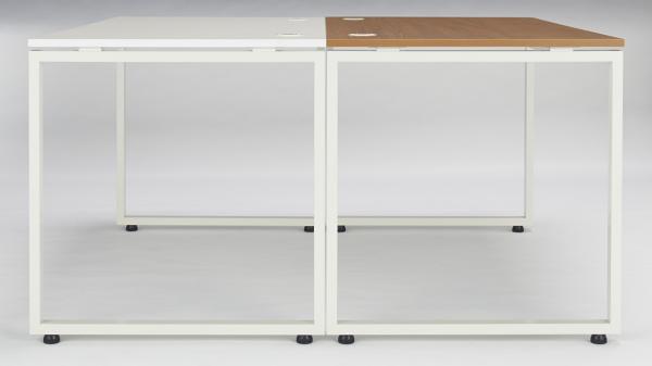 構成要素を最小限に削ぎ落としたシンプルなデザイン。厚さ18mmの薄型天板と、継ぎ目を感じさせないロの字(スクエアフレーム)脚、補強と機能性を兼ねた天板裏フレーム。この無駄のない洗練されたデザインが、明るく開放的な空間を創造し、オフィスのインテリア性を高めます。