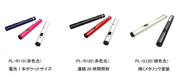赤色光(ドット)タイプには波長650nm(ナノメートル)モデルより約2倍明るく感じる635nmのダイオードを採用。女性にもお勧めの明るいネイビー、ピンク、ホワイトを揃えた「PL-R110」は、全長を短くコンパクトにするため単4形アルカリ乾電池1本で使用できるようにしました。