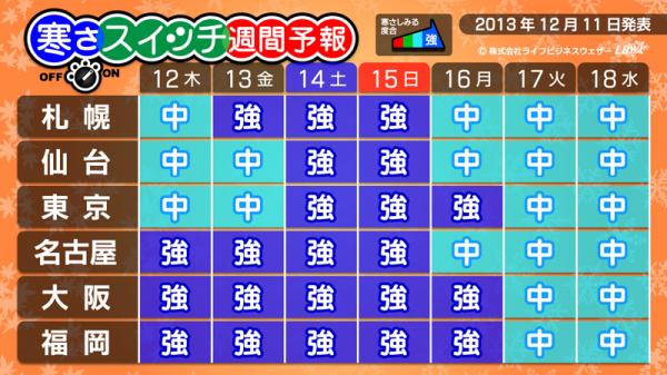 『寒さスイッチ予報』とは・・・この先一週間は寒く感じるのかどうか、一日の気温だけではなく、風や湿度、前日や平年との気温差などを考慮したLBW独自のアルゴリズムをもとに発表している予報です。