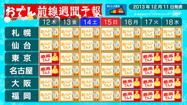 『おでん前線』とは・・・体感気温などの要素からLBW独自のアルゴリズムから導きだした「おでんの食べ頃」を伝える予報。「食べるなら今でしょ!」というタイミングがわかります。