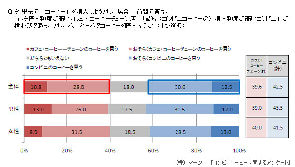 また、 普段最も購入している「カフェ・コーヒーチェーン店」と、普段最も購入している「コンビニ」の店が横並びであったとしたら、どちらのコーヒーを購入するか 尋ねたところ、「カフェ・コーヒーチェーン店でコーヒーを購入する/おそらく購入する」が39.6%、 「コンビニコーヒーを購入する/おそらく購入する」が42.5%と、カフェ・コーヒーチェーンをコンビニやや上回る結果となった。