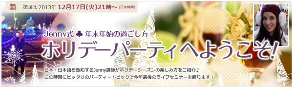 第8回目を迎える今回は、日本・日本語を熟知するJenny講師がホリデーシーズンの楽しみ方のご紹介。今年最後のライブセミナーを、この時期ならではのトピックで締めくくります。