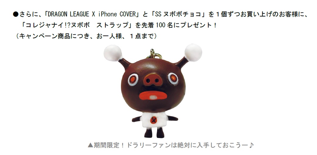 さらに、「DRAGON LEAGUE X iPhone COVER」と「SSヌボボチョコ」を1個ずつお買い上げのお客様に、「コレジャナイ!?ヌボボ ストラップ」を先着100名にプレゼント!(キャンペーン商品につき、お一人様、1点まで)