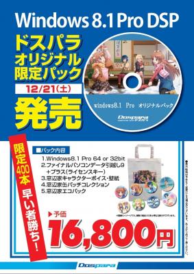 全国20店舗及びウェブ通販のパソコンショップを運営する株式会社ドスパラ(代表取締役社長:尾崎健介、本社:東京都千代田区)は、2013年12月21日(土)より、全国20の「ドスパラ」各店舗にて、『Windows 8.1 Pro(DSP版) ドスパラオリジナルパック』2製品を限定発売いたします。