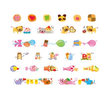 カラフルなフルーツがトッピングされた「パフェ」や、チョコや手紙などを運ぶ「フウセン」などお菓子を可愛くデザインした柄や、ネコとヒヨコが仲良く話す「イトデンワ」、手紙を運ぶ「ハムスター」など想いを伝えてくれる動物たちの計6柄をラインアップ。