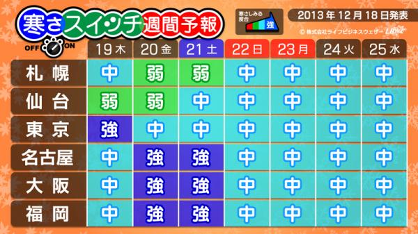 『寒さスイッチ予報』とは・・・この先一週間は寒く感じるのかどうか、一日の気温だけではなく、風や湿度、前日や平年との気温差などを考慮したLBW独自のアルゴリズムをもとに発表している予報