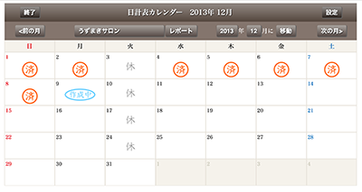 日計表カレンダー画面では、入力を完了している日には「済」スタンプが表示され入力有無が一見してわかるほか、一時保存した入力途中の日には「作成中」スタンプが表示され入力漏れを防止できます。また、休業日を選択した日には「休」マークが表示されます。日計表を登録する都度、日計表カレンダーがスタンプで埋まっていき、視覚的に達成感を感じられます。