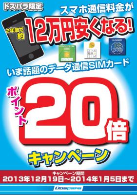 全国20店舗及びウェブ通販のパソコンショップを運営する株式会社ドスパラ(代表取締役社長:尾崎健介、本社:東京都千代田区)は、2013年12月19日(木)より、対象のデータ通信SIMカード製品ご購入時の付与ポイントが通常の20倍となる
